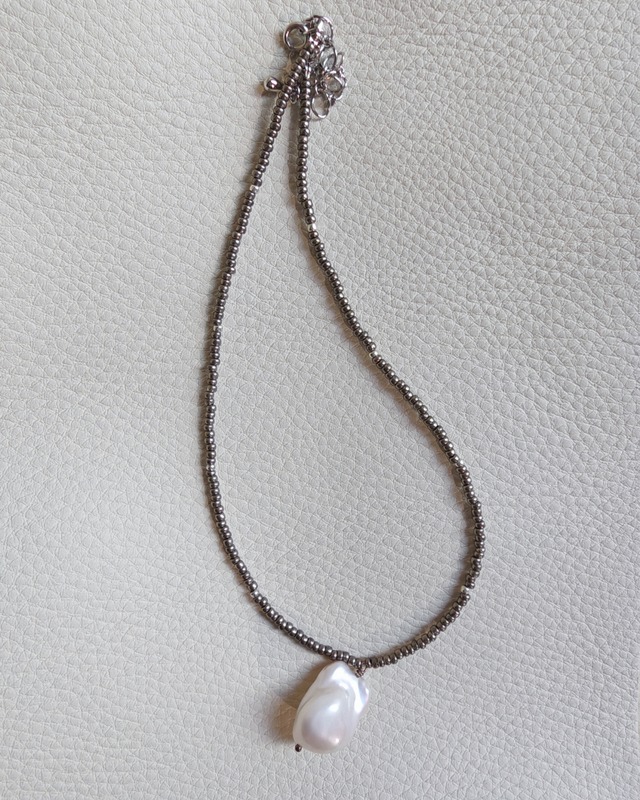 hand made series バロックパールの一粒ネックレス シルバーカラーののビーズはvintageビーズとなります。シンプルですが バロックパールのサイズも大きすぎ小粒過ぎないオススメのサイズです。 カジュアルにもキレイめにも付けやすいネックレスです。 全長 約31cm ※アジャスト5cm バロックパールは横 1cm 縦1.8cmサイズ ワイヤーで作成しているので相当な不可のない限り ご愛用していて切れたりすることはもちろん無いよう作成しております。 天然石や淡水パールや硝子ビーズでの作成となります落としたりなどの衝撃にはご注意下さいませ。 淡水パールのサイズの違いや色合い等は天然特有の個性となります。