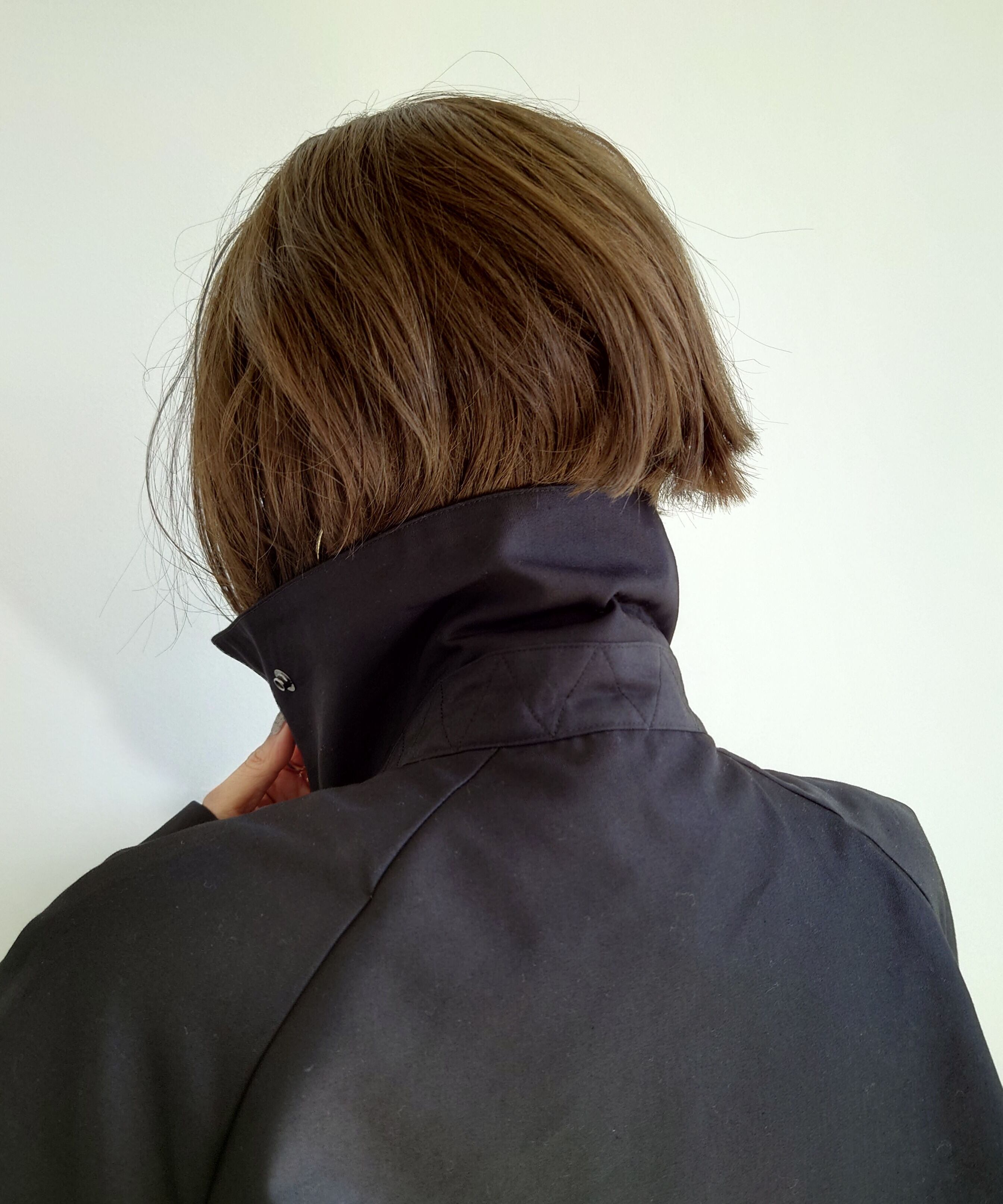 首元も後ろ姿のジグザクのステッチやタブは取り外しが出来るようにしステンカラーコートのようにも変化します。ボタンもあえてドットボタンでベージュにはマットシルバー、ブラックには少しブラックニッケルで本当に少しの変化を付けています。
