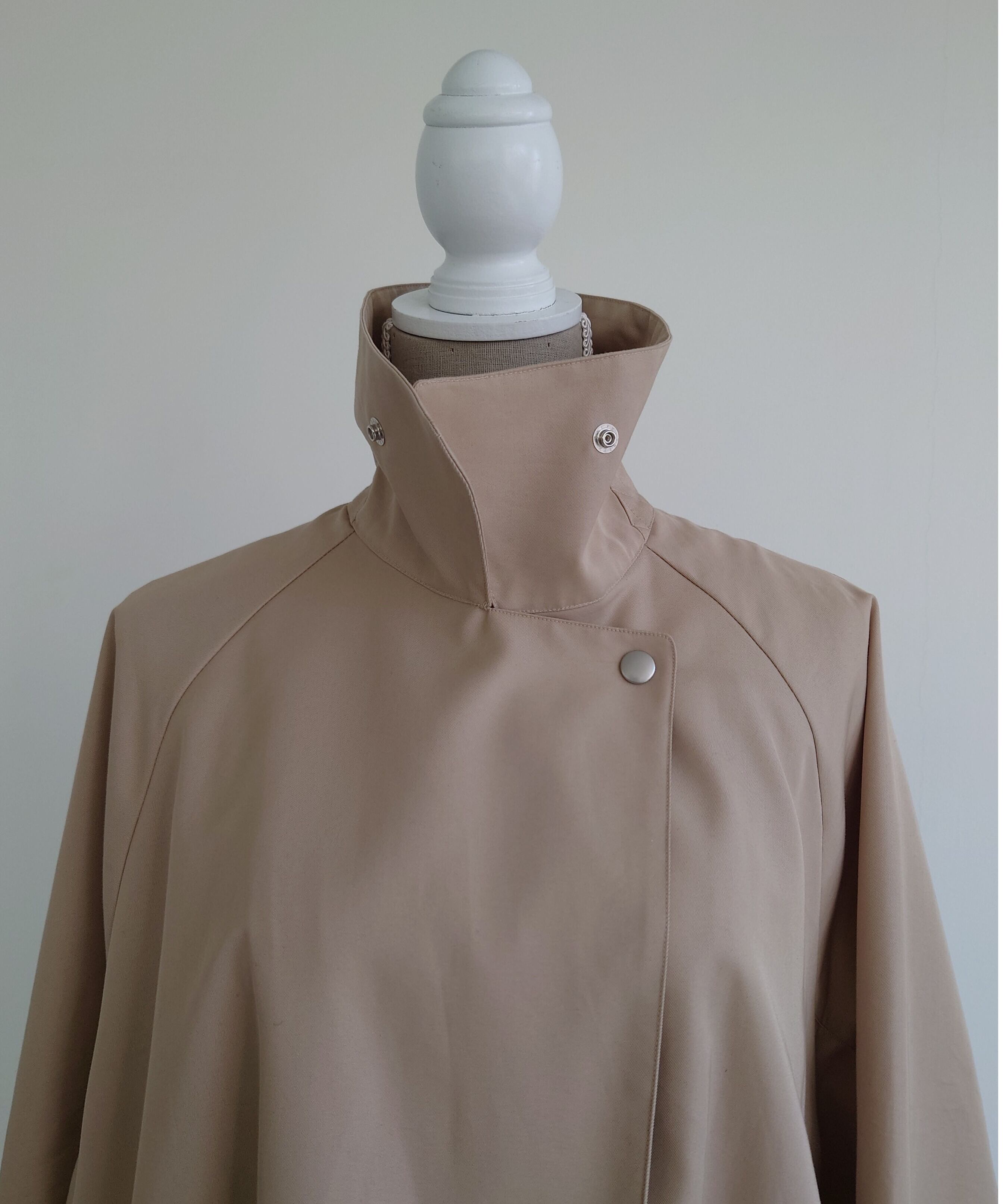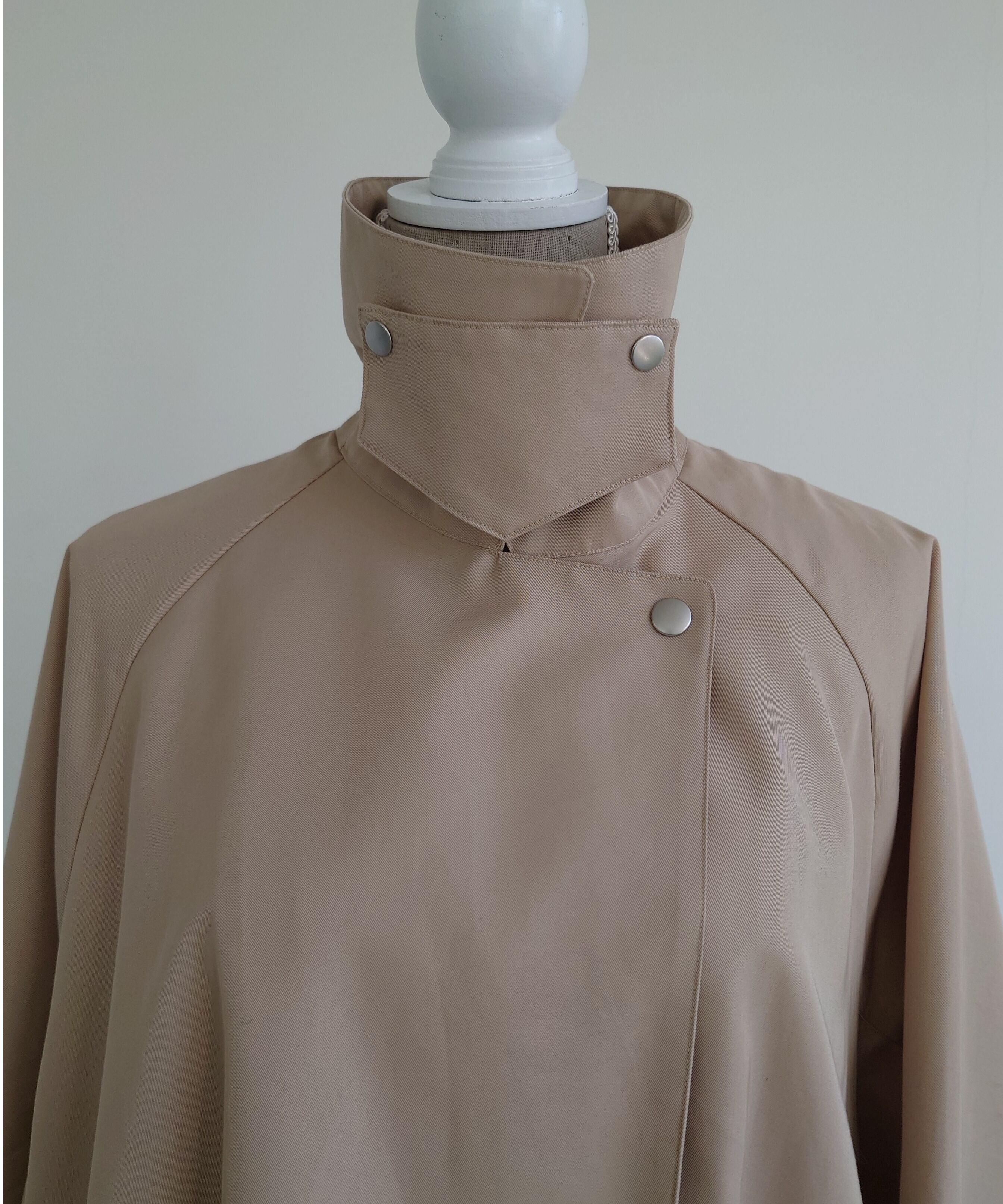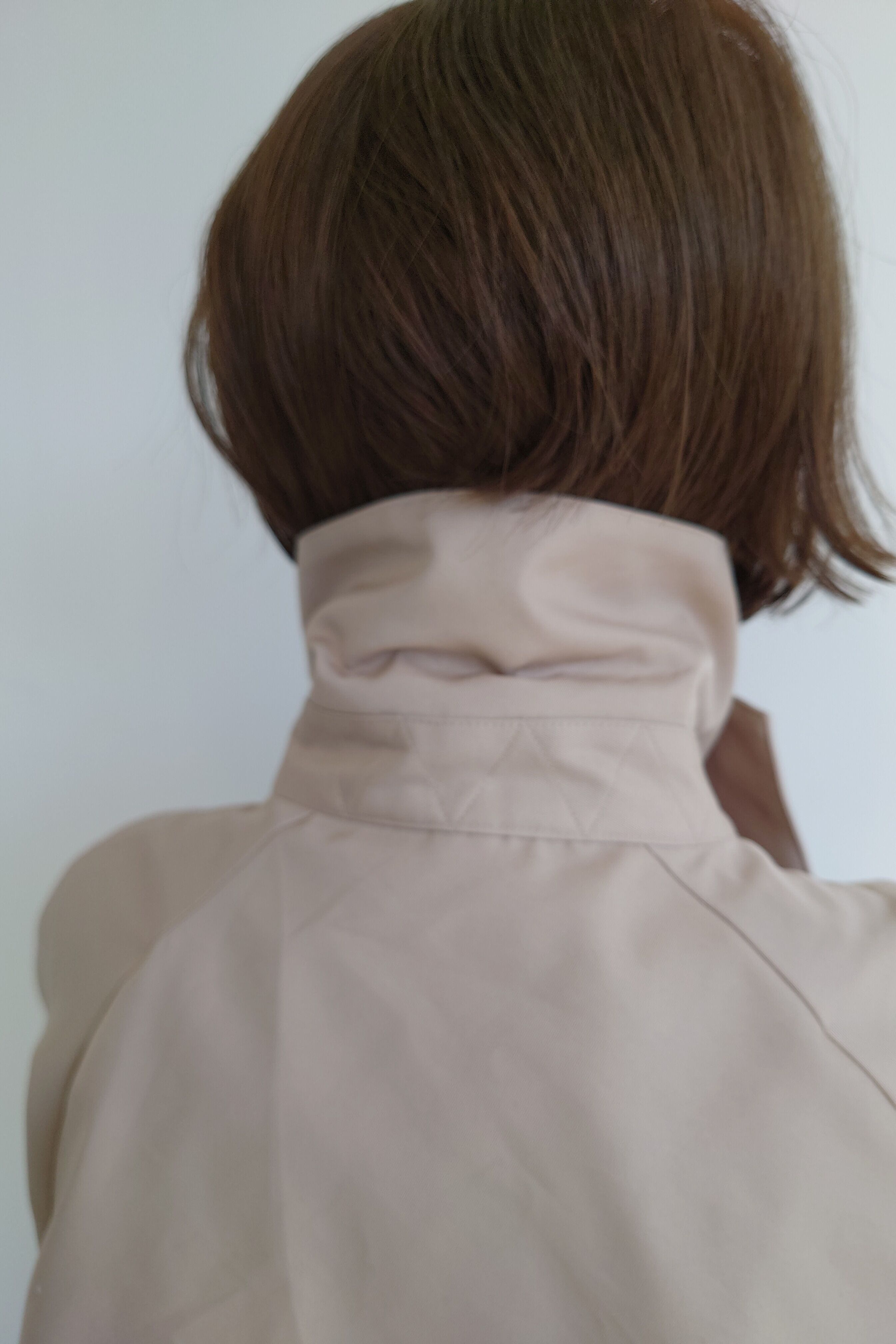 首元も後ろ姿のジグザクのステッチやタブは取り外しが出来るようにしステンカラーコートのようにも変化します。ボタンもあえてドットボタンでベージュにはマットシルバー、ブラックには少しブラックニッケルで本当に少しの変化を付けています。