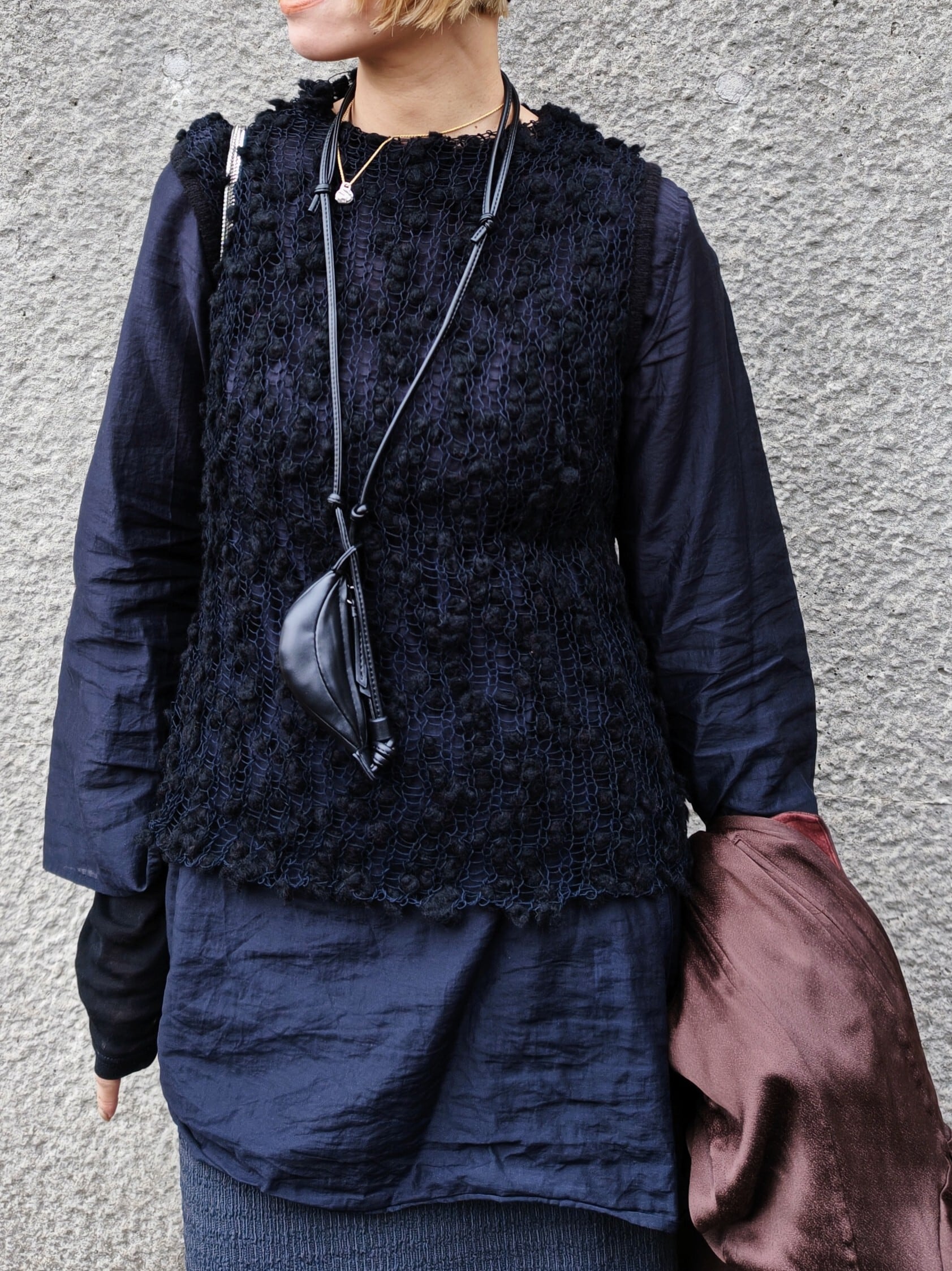 首元は軽く見えるように断ち切りのデザインにし、日常の生活の中で動きが出やすい手元は三つ折り縫いに仕上げ、手元にはスリットをプラスし折り返しもしやすい様に、そして裾はメロウ始末で着用時の軽さも大切にしたシンプルながら細部にも拘りました。
