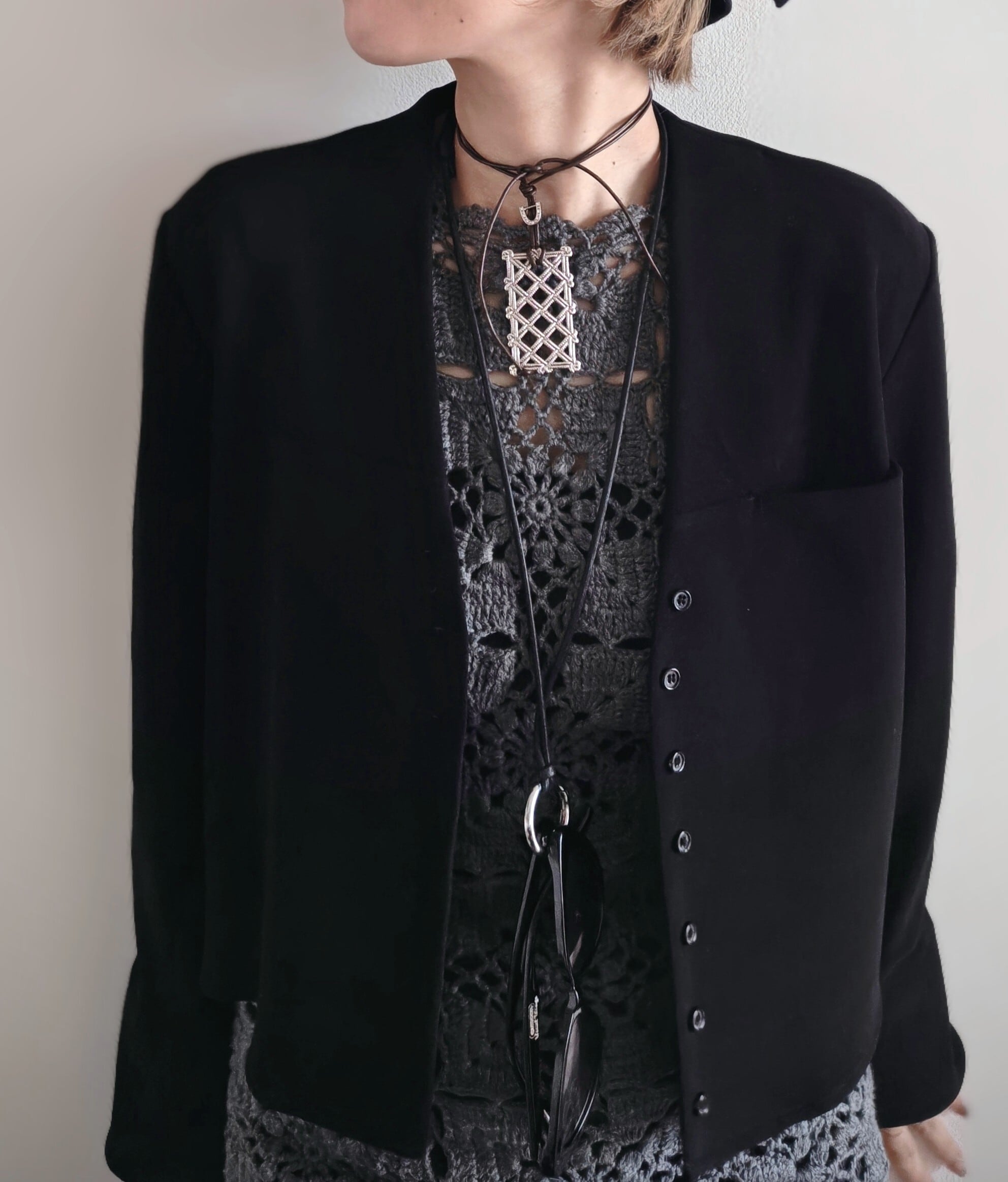 こちらの1番上のボタンはバランスを取るためにもデザインとして追加したボタンなのですが使用も可能にし、こちらのボタンをとめると胸元が少し締まるイメージとなります。