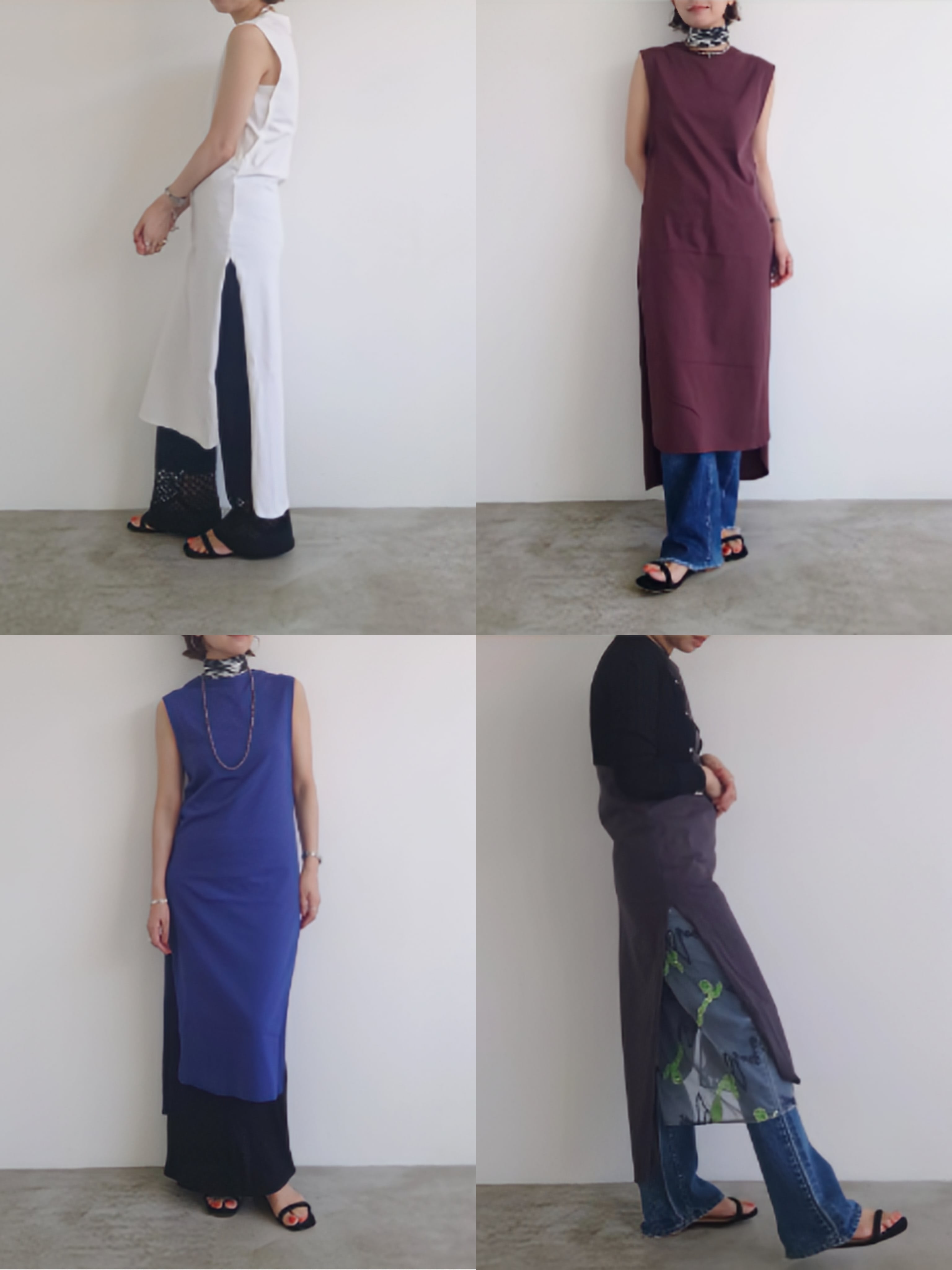 パンツはスリムでもワイドでも相性がよく、もちろんスカートや冬場にニットからレイヤードさせたりするのもおすすめです