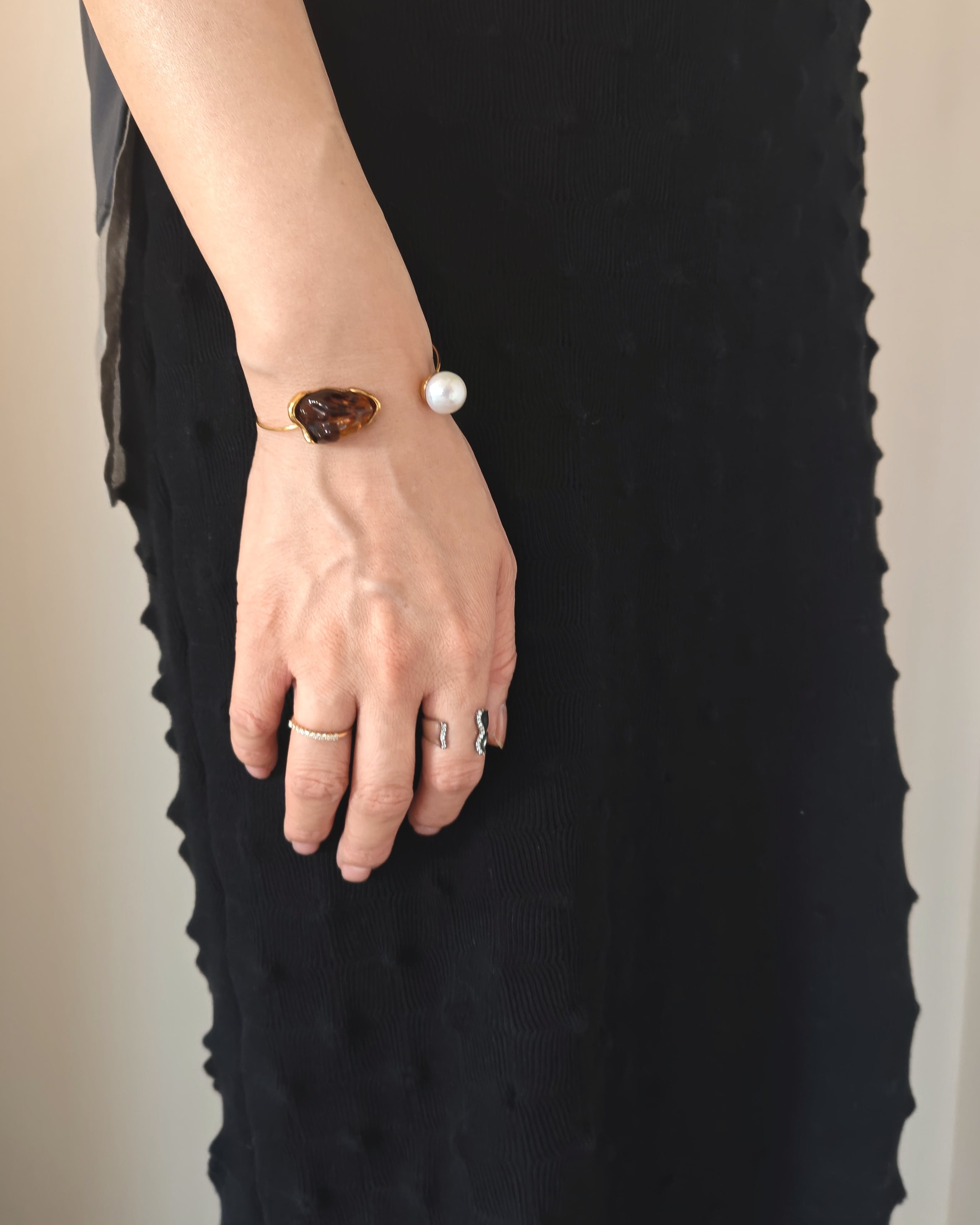 記憶を手さぐりで再現したような、曖昧で有機的なフォルムが印象的なEngram(=記憶痕跡)シリーズのバングル。曖昧な記憶の断片をかたどったような、独自のフォルムが魅力的な樹脂の立体モチーフと淡水パールの存在感と肌になじむなめらかなしなやかなワイヤーの曲線が繊細さを表現したデザイン