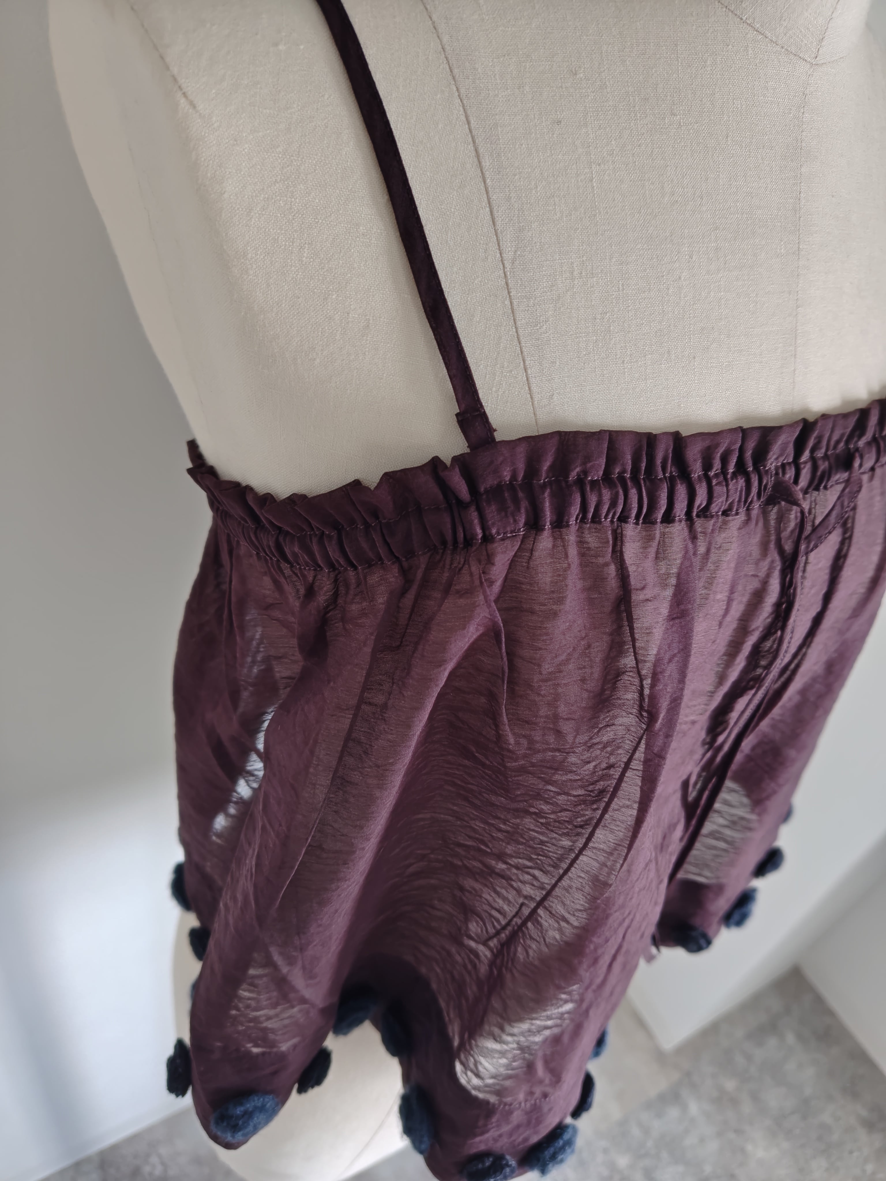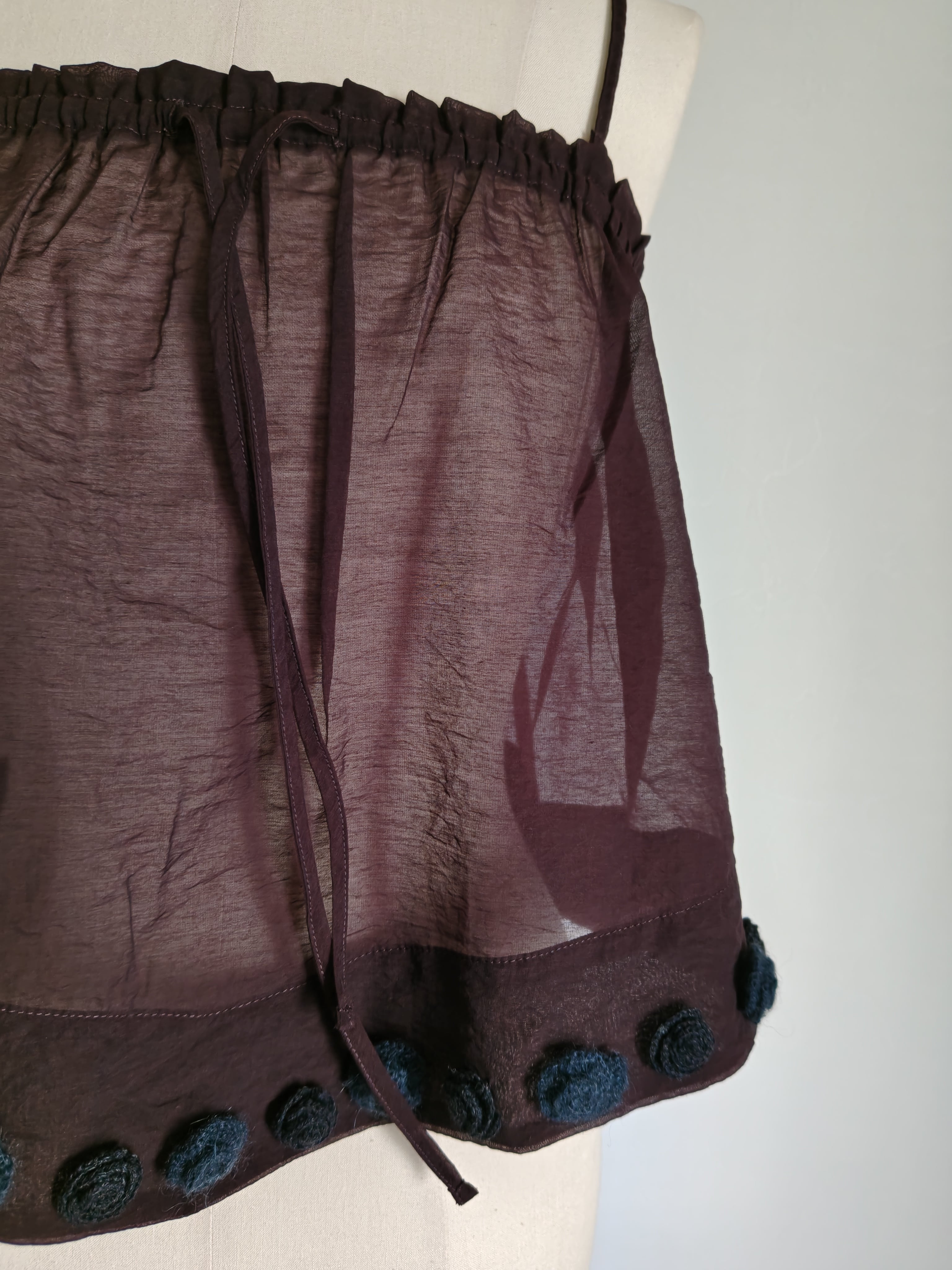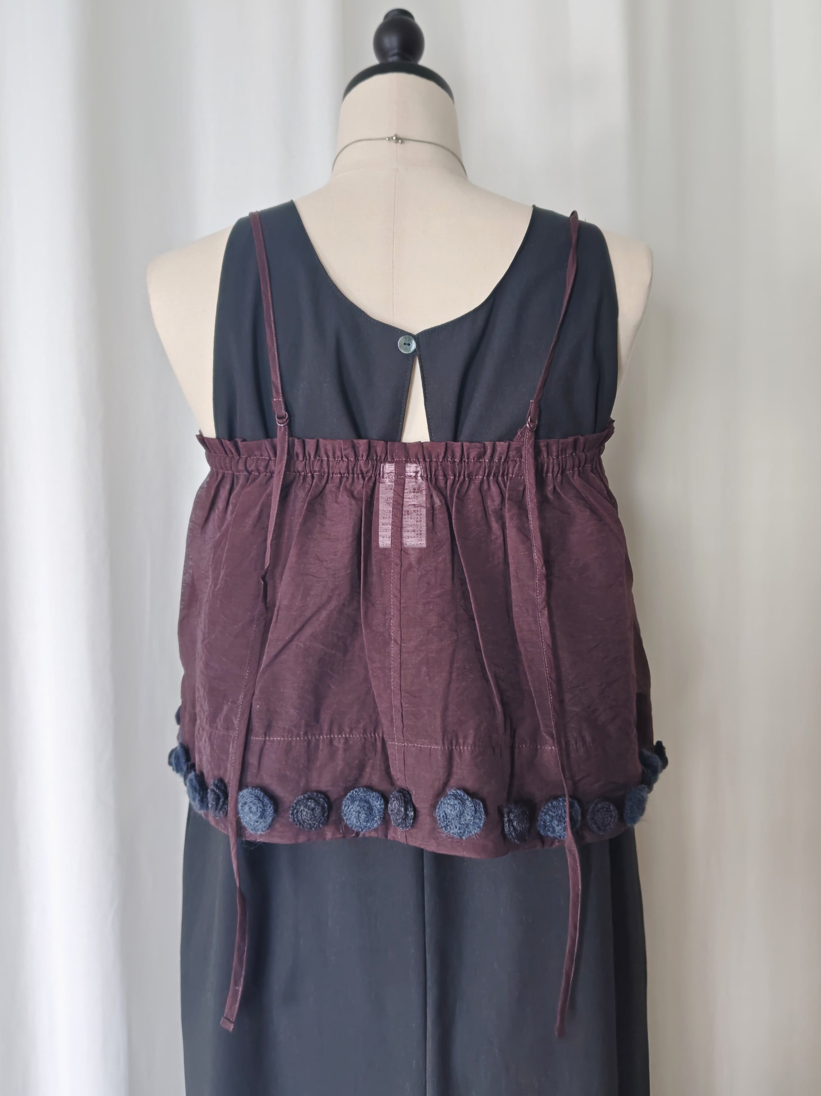 シアーで凹凸感のある生地に手編みで編んだ小さなローズのモチーフが並んだキャミソールです。肩紐が取り外せる仕様で、キャミソールとしてもレイヤードスカートとしても着用が可能となります。