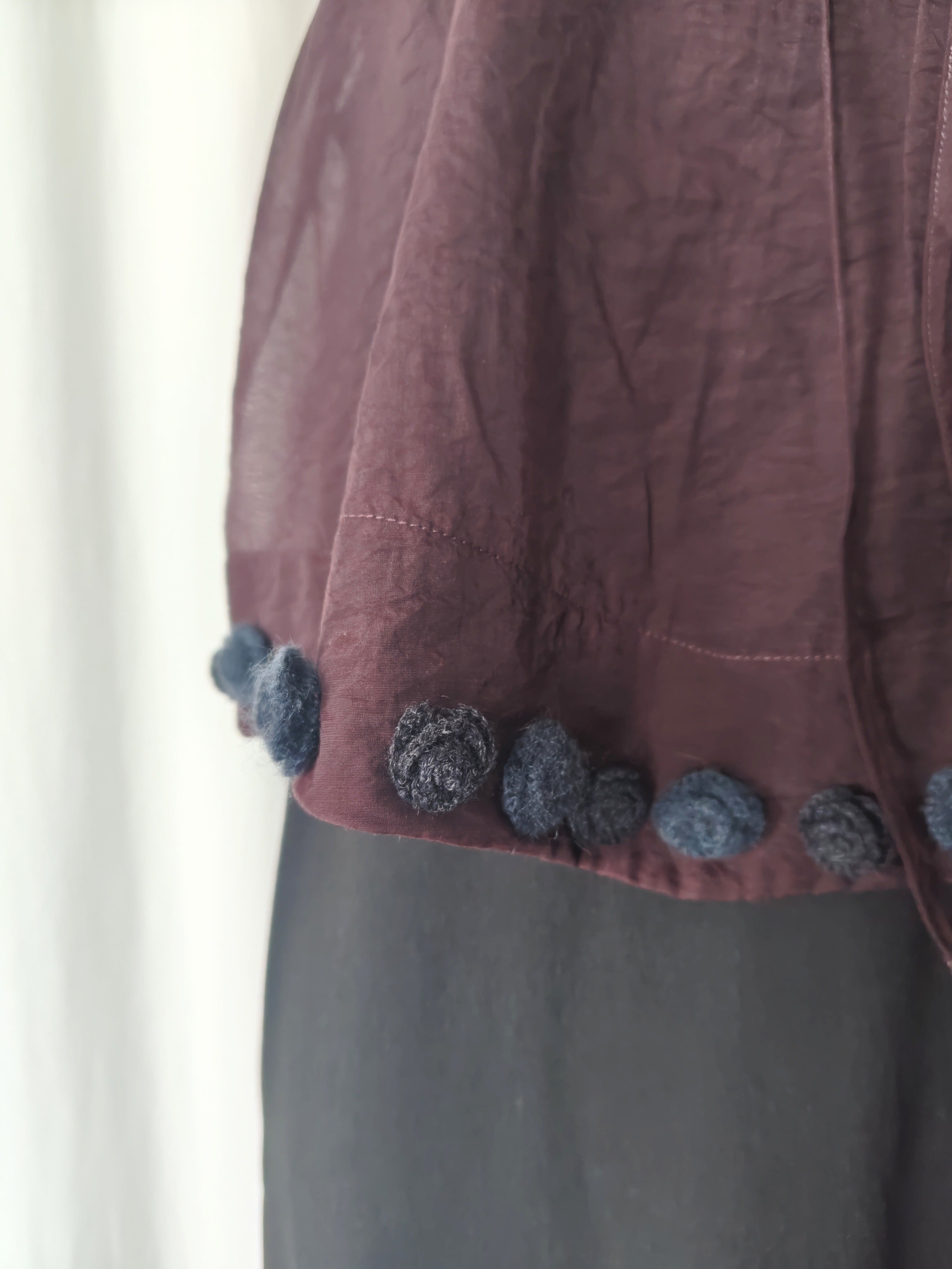 ボルドーのシアー生地にチャコールとネイビーのニットモチーフとなります