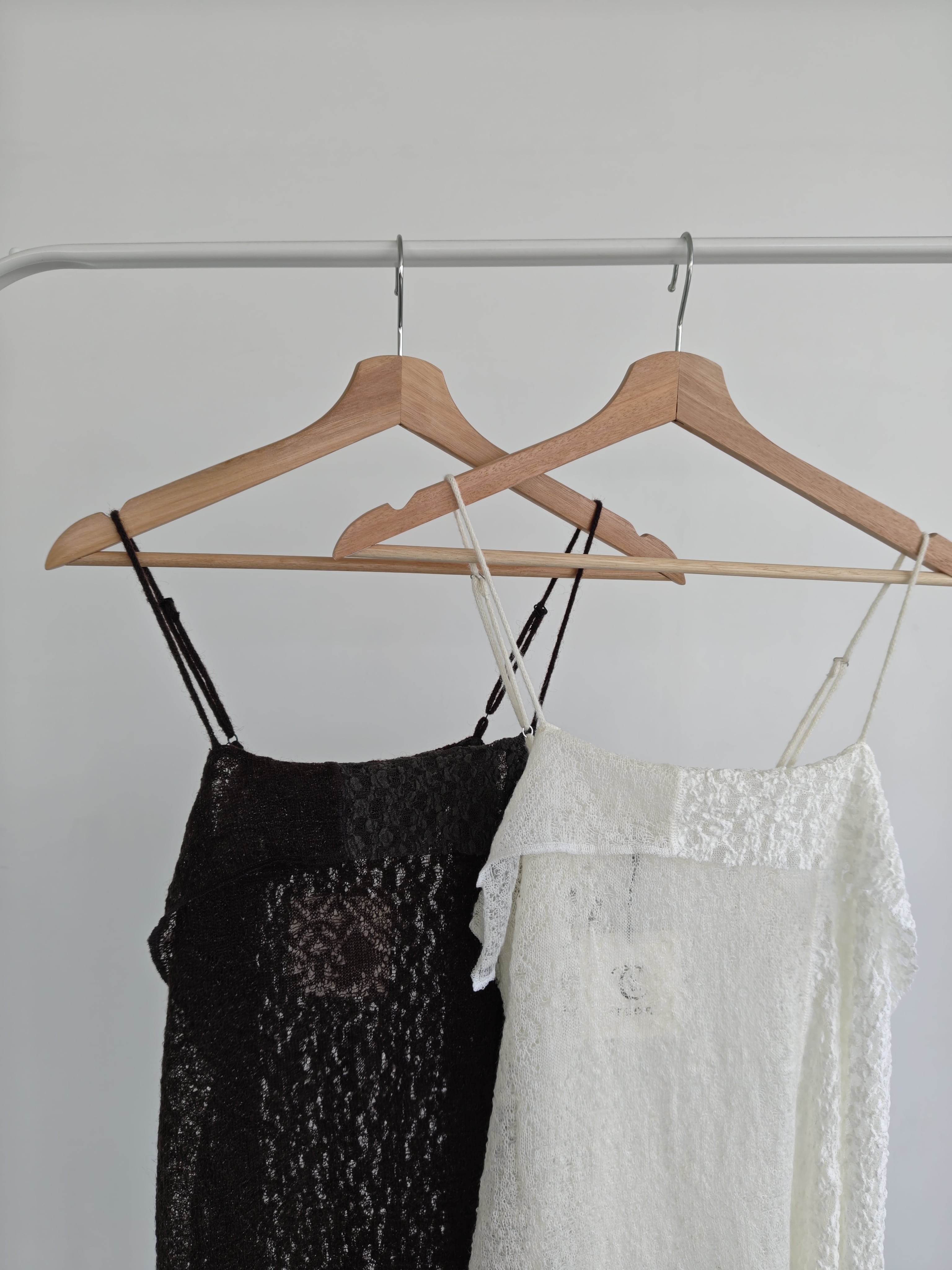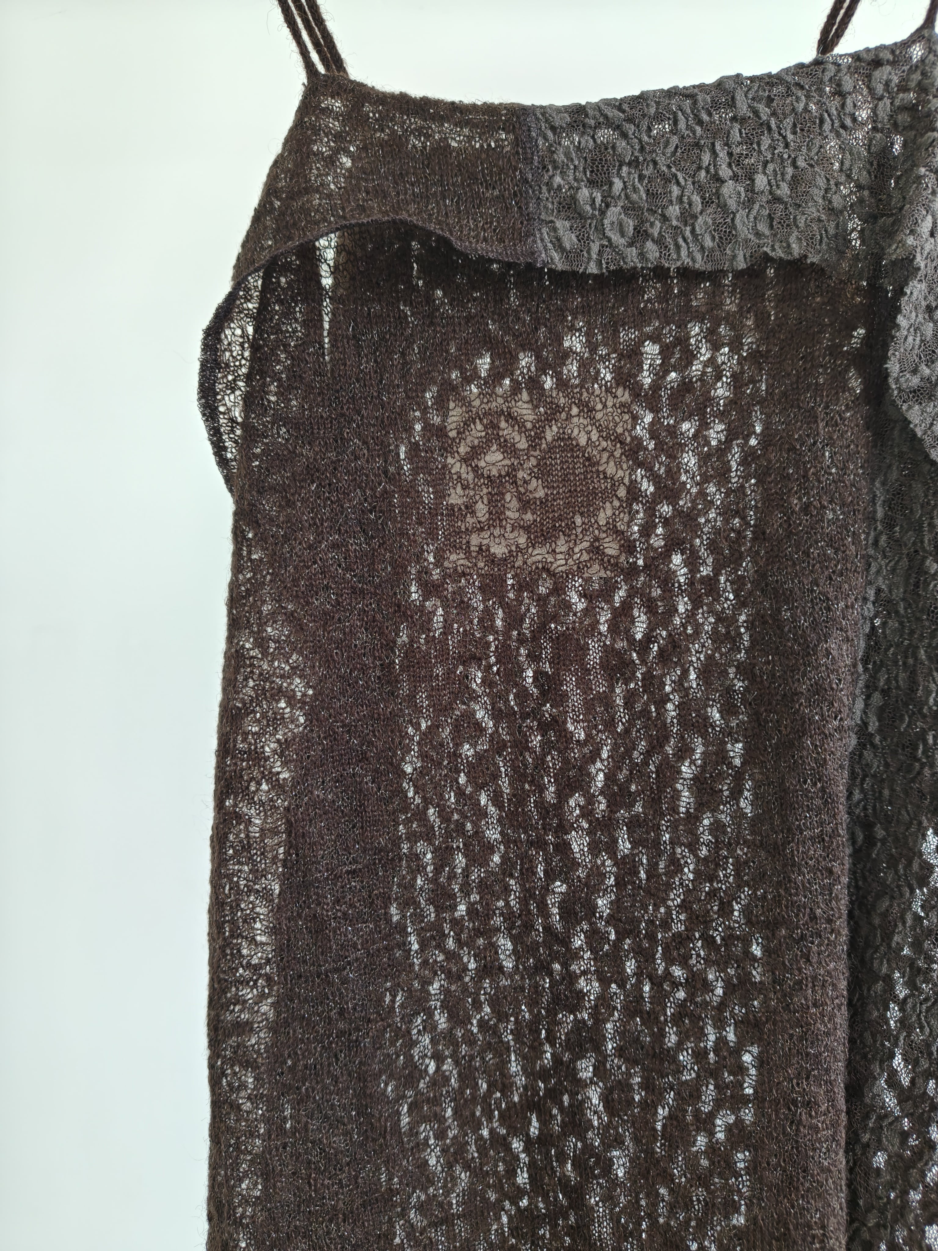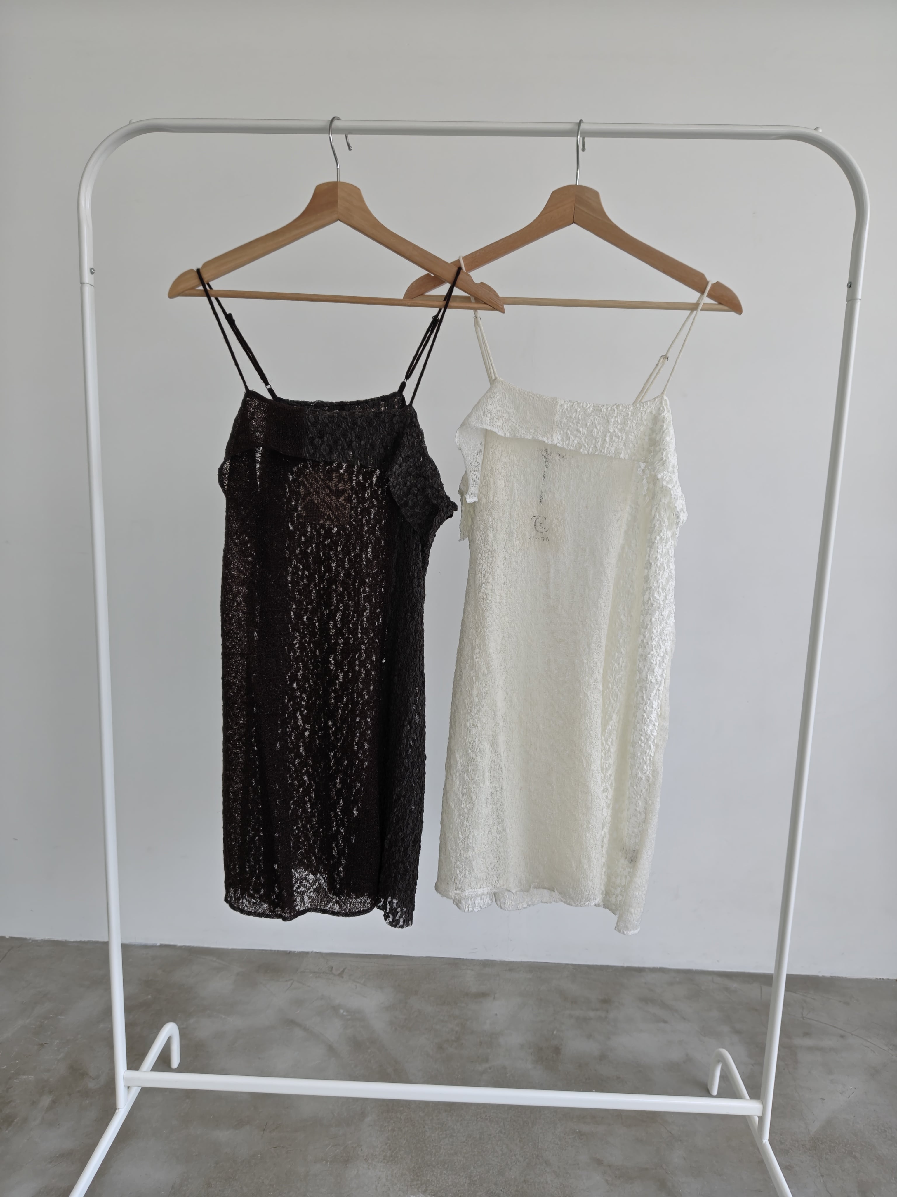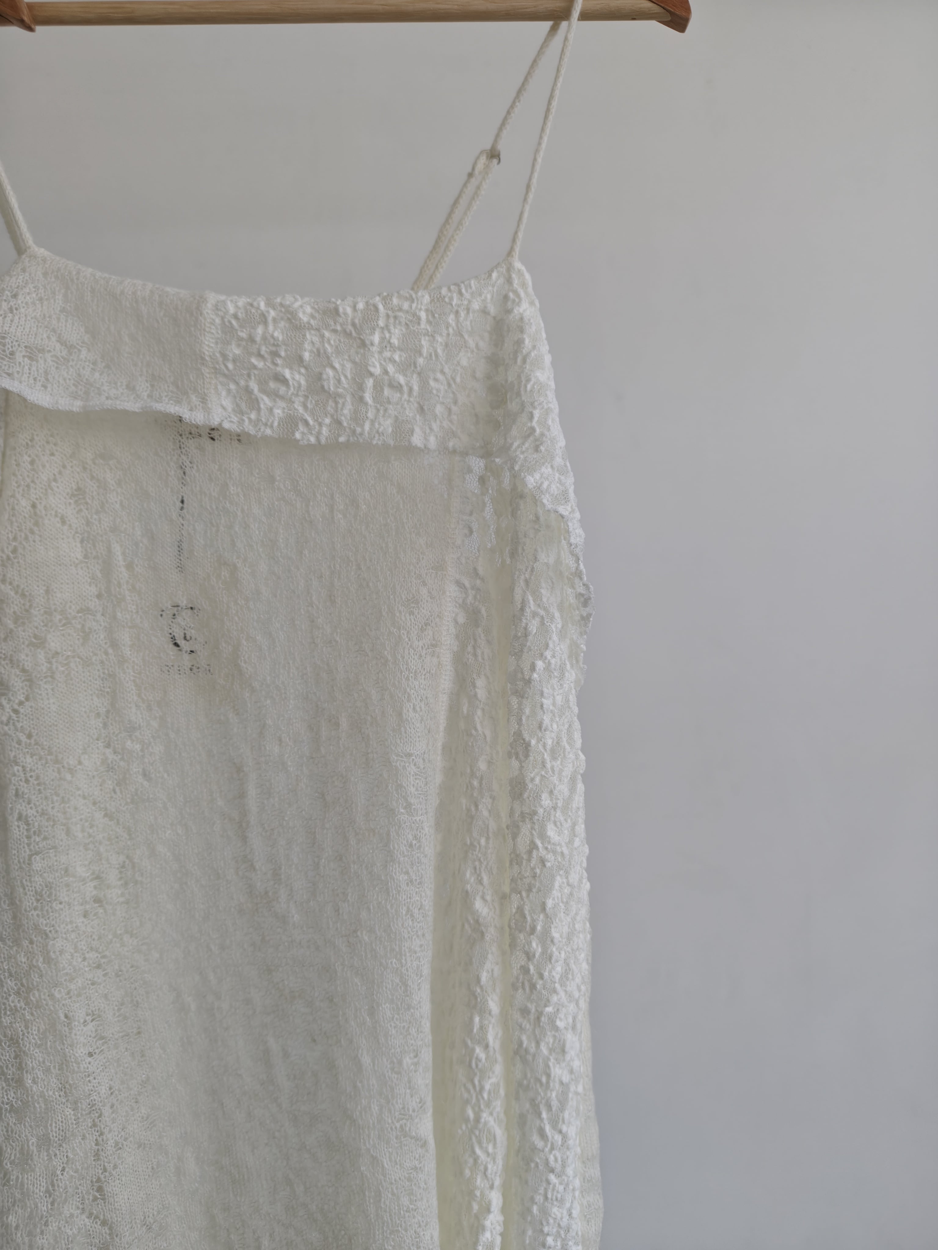 モヘヤ混の糸とクリアな糸を組み合わせてレース編みにした生地を、シュリンクレースと合わせました。アシンメトリーな切替が特徴のロングキャミソールで、まだまだ暑い時期でも着られ、季節感も取り入れられるアイテムです。Lace×jacquard lace topと同色シリーズとなります。