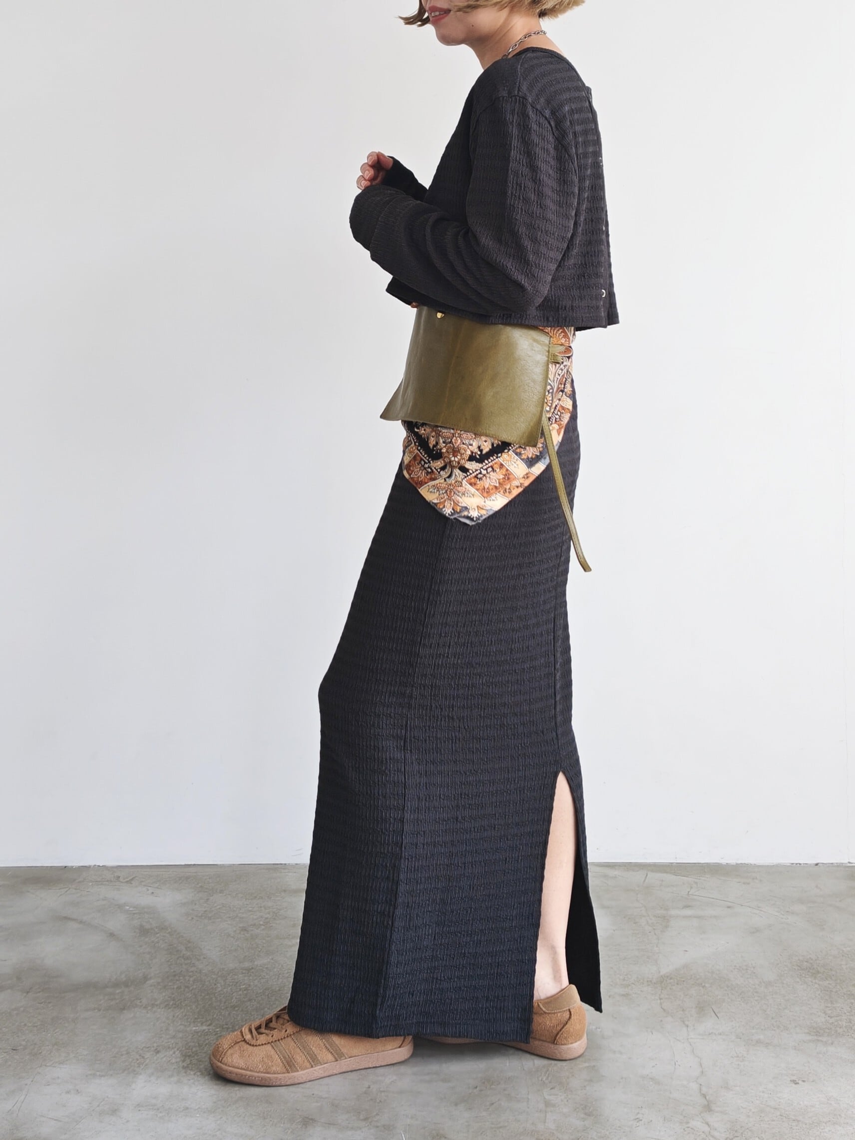 ヒップからもものサイズ感を少し大きくしたので腰回りから裾にかけて少しだけ細めにデザインしスッキリと見える仕様に、そしてマキシ丈でも足捌きがよく動きやすいようにスリットが35cmで動きやすく。