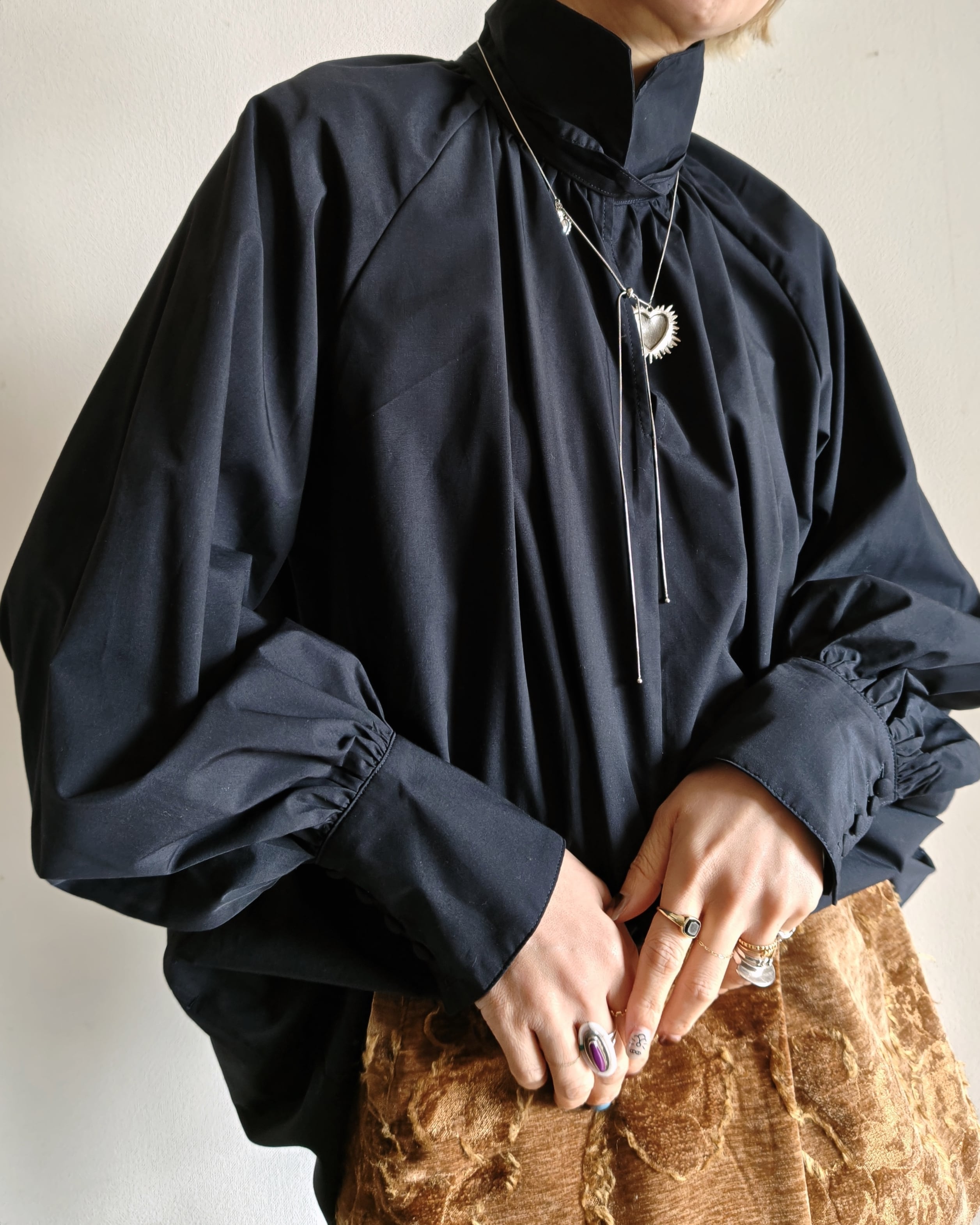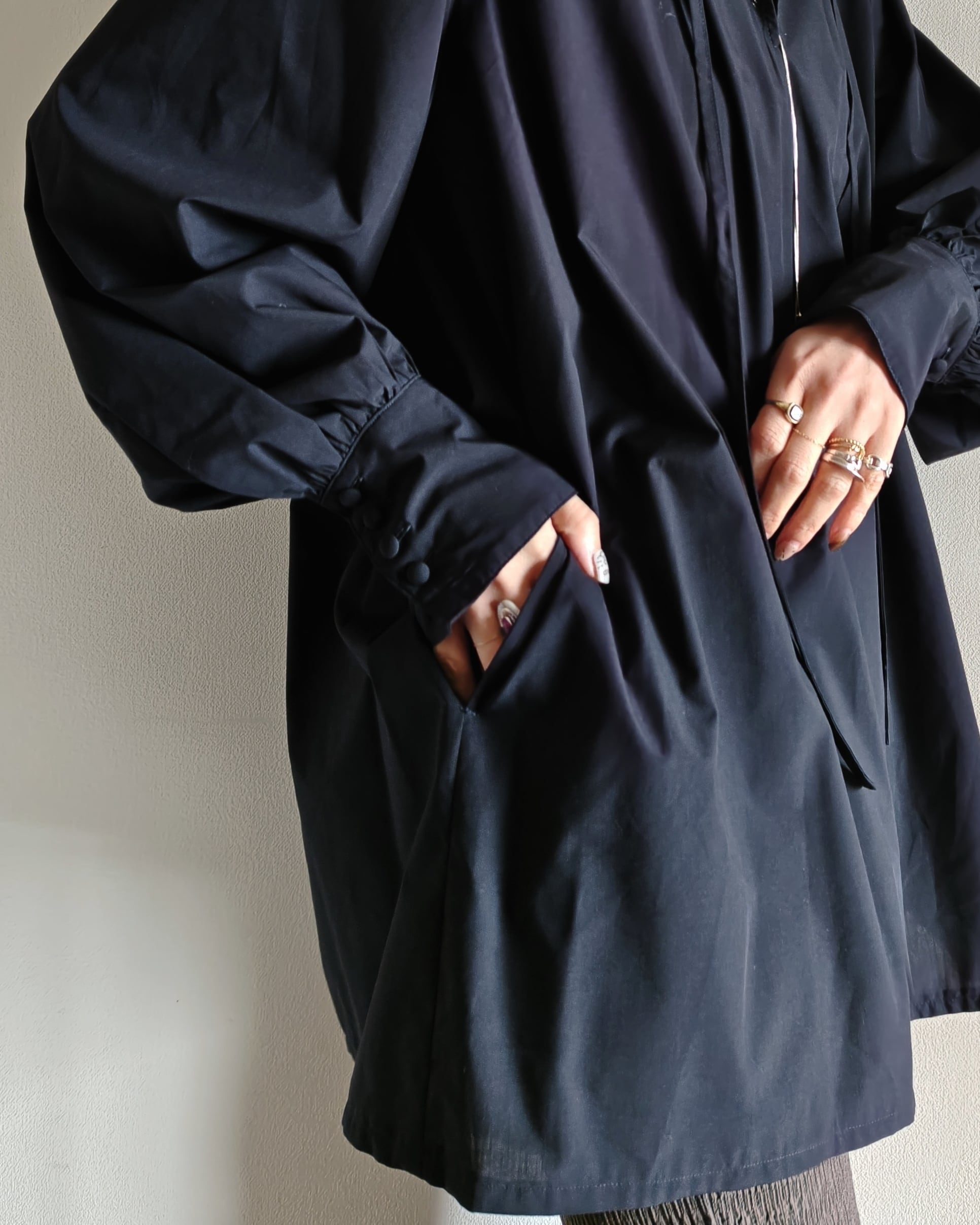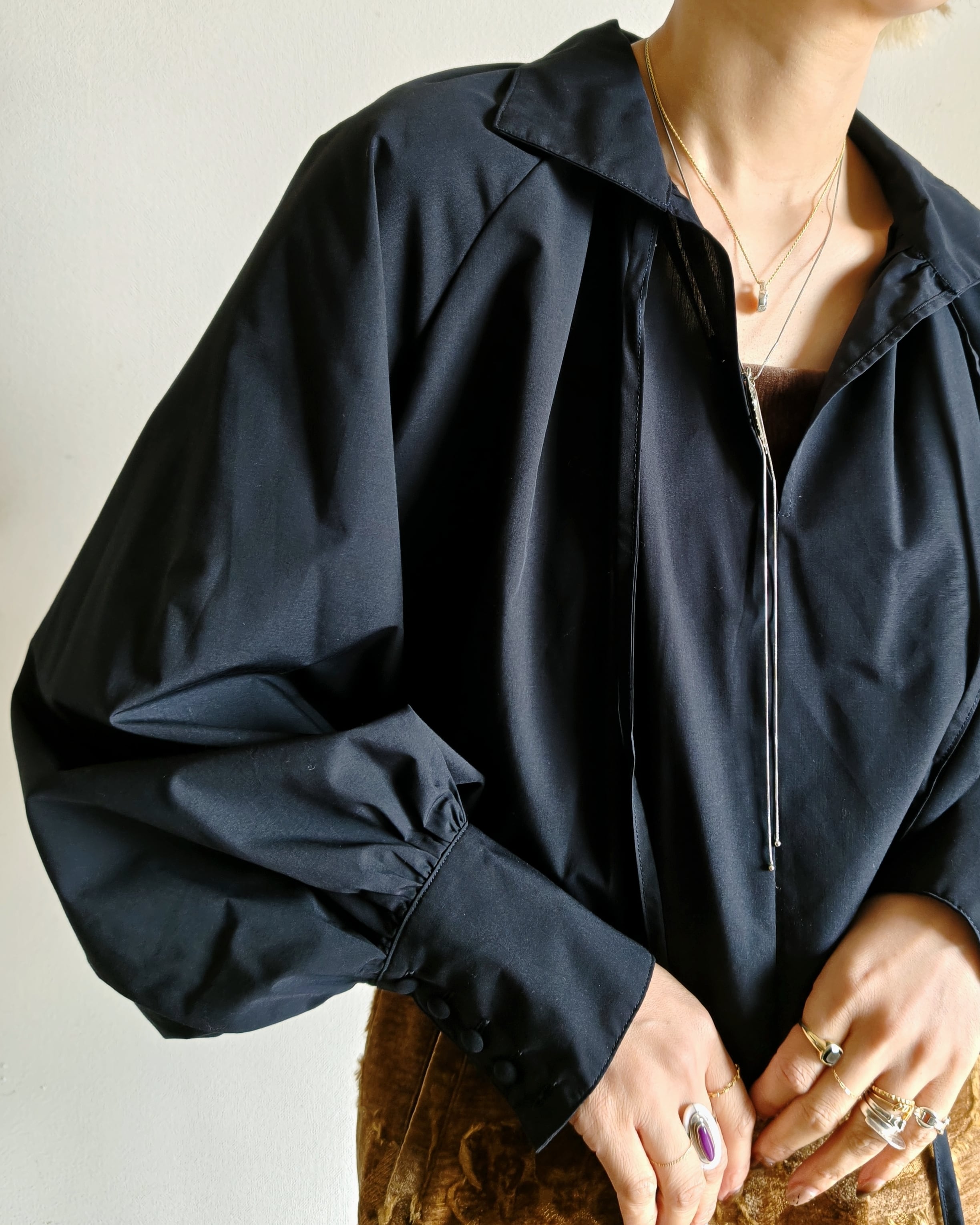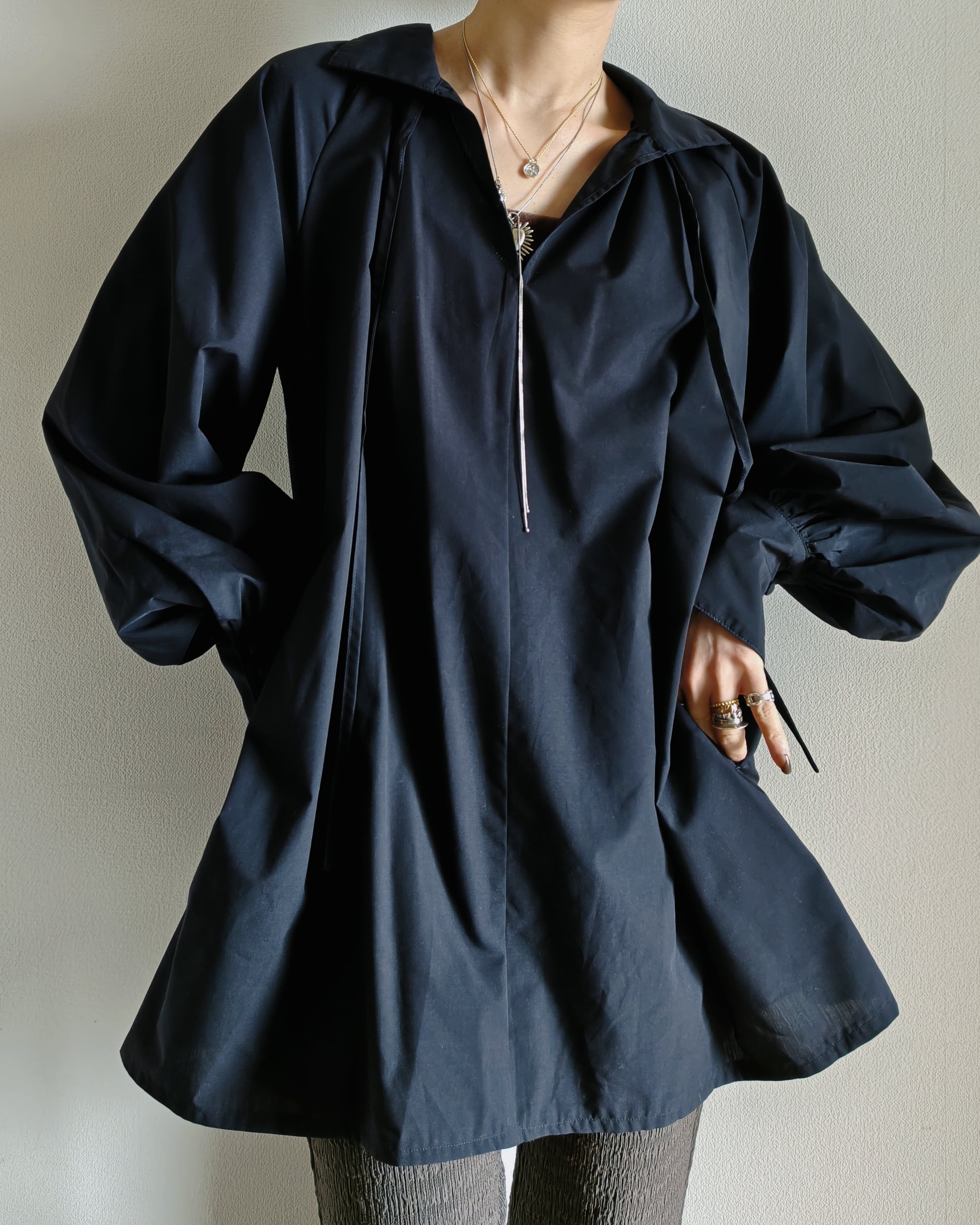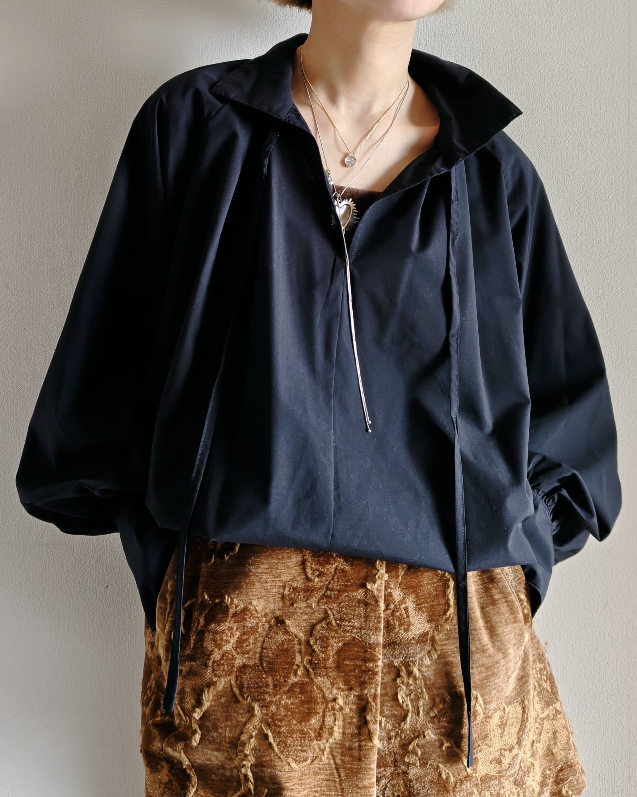 またボトムやスカートなどに少しinをして着丈バランスを調整して頂いたり、ラップスカートとstylingをしたりと着こなしで印象の変化するブラウスとなります。