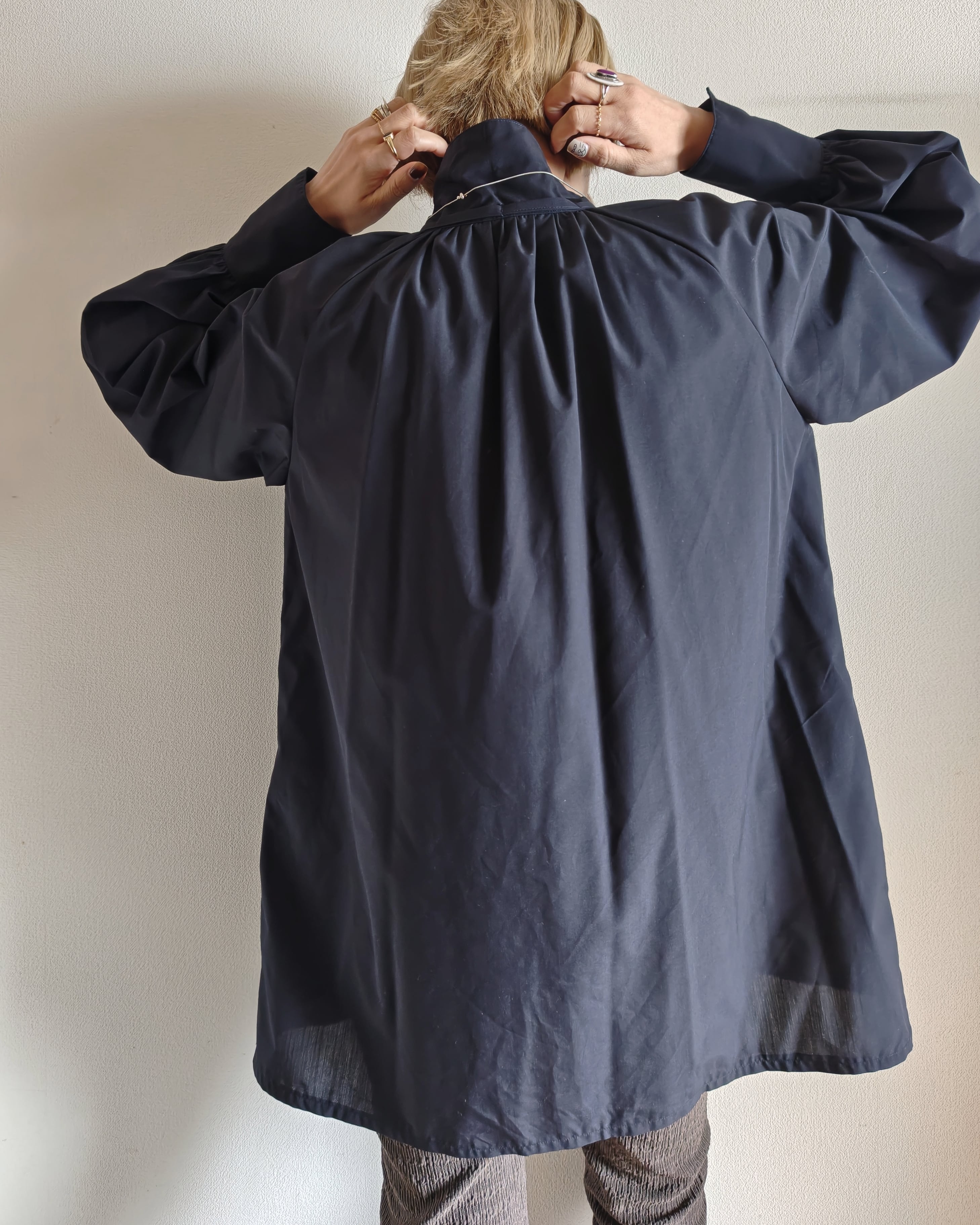 腕回りは肩からラグラン付きにしボリュームをもたせて手元はカフスを少し長く、細かなくるみボタンで上品に仕上げました。肩がラグラン付きなので着心地も楽ちんです。シームポケット付き。