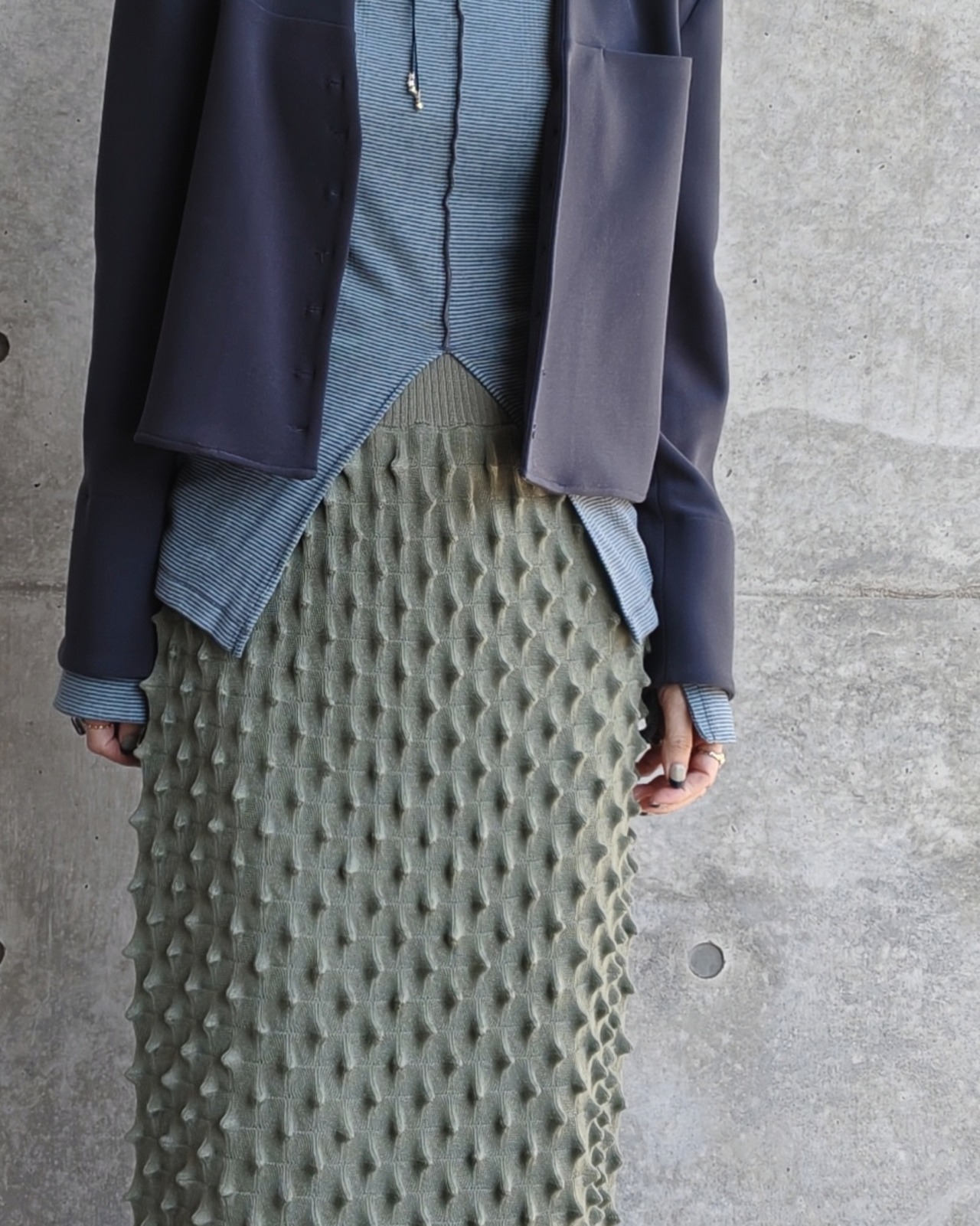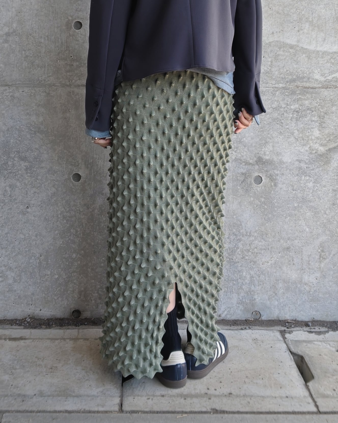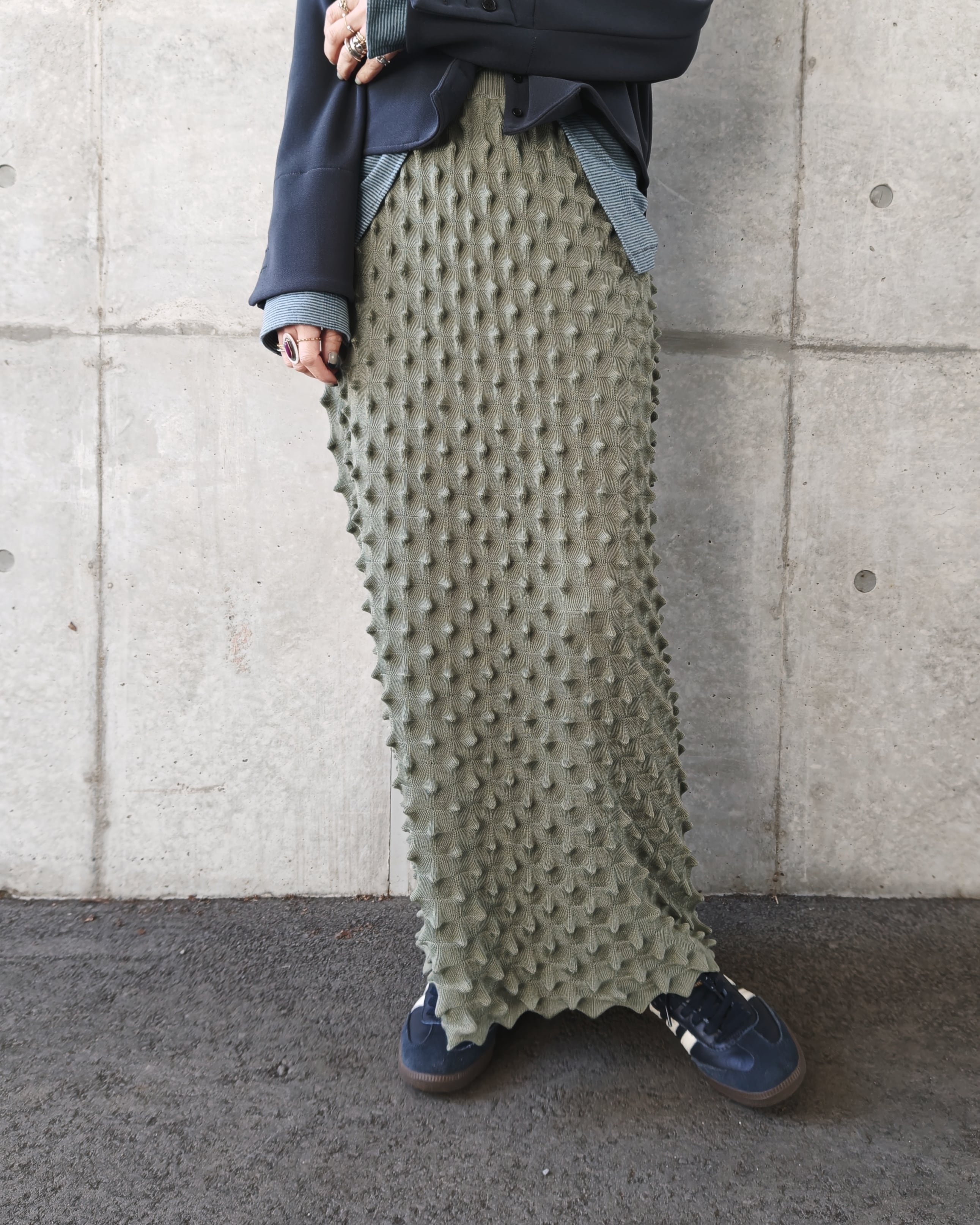 定番のdurian long skirtはネーミングのようにドリアンのようなポコポコとした編み地が特徴的なタイトスカート。ストレッチ性がある素材と凹凸のある素材の特性でボディラインを拾いすない、履き心地のよい素材感と体を包み込むシルエットで1年中stylingしやすいスカートです。OPEN SESAME CLUBの定番で人気アイテムの1つ